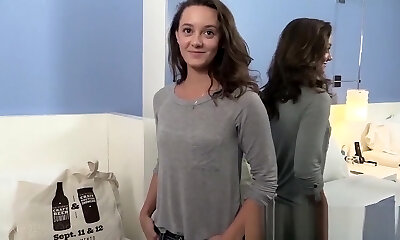 Svelte naive looking brunette student hops on thick hard boner with uused pussy