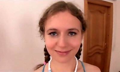 Charming cutie with pigtails provides a strong humungous dick with a sout blowjob
