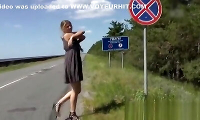 Sweet Russian teen stunner by the highw3ay flashes her pussy