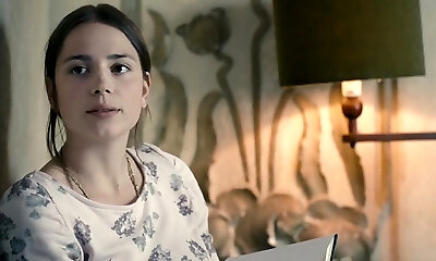 Clemence Poesy lounging on her back in bed as a guy smoochis her