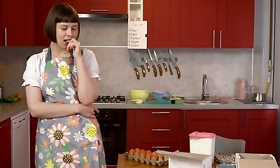 Small orbs solo babe Sandy Cheeks masturbates in the kitchne